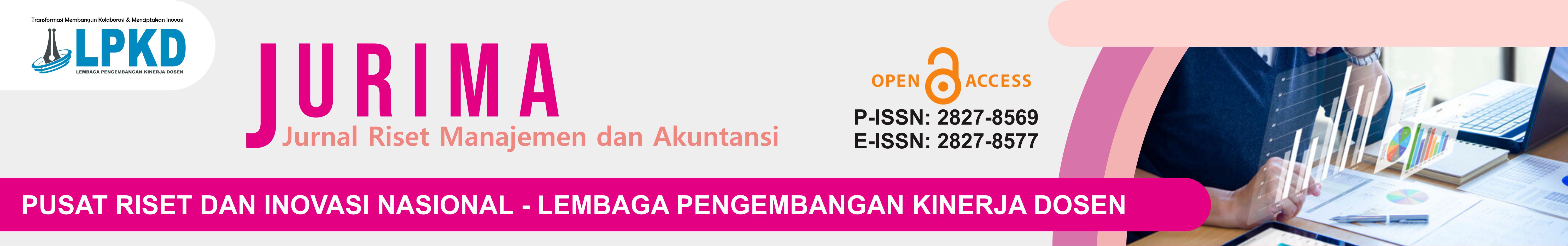 urnal Riset Manajemen dan Akuntansi (JURIMA) : ISSN:2827-8569 (cetak), ISSN: 2827-8577 (Online) berfokus pada penerbitan artikel berkualitas tinggi yang didedikasikan untuk semua aspek penelitian, masalah, dan perkembangan terbaru di bidang Ilmu Manajemen.Jurnal ini terakreditasi SINTA 5 (Surat Keputusan Direktur Jenderal Pendidikan Tinggi, Riset, dan Teknologi Nomor 0173/C3/DT.05.00/2025 tanggal 21 Maret 2025 tentang Peringkat Akreditasi Jurnal Ilmiah Periode I Tahun 2025) dimulai dari Volume 2 Nomor 1 Tahun 2022 sampai Volume 6 Nomor 2 Tahun 2026. Topik dalam Jurnal ini berkaitan dengan aspek apapun dari manajemen, namun tidak terbatas pada topik berikut : Manajemen Sumberdaya Manusia , Manajemen Keuangan, Manajemen Pemasaran, Manajemen Sektor Publik, Manajemen Operasional, Manajemen Rantai Pasokan, Corporate Governance, Etika Bisnis, Akuntansi Manajemen dan Pasar Modal dan Investasi.
